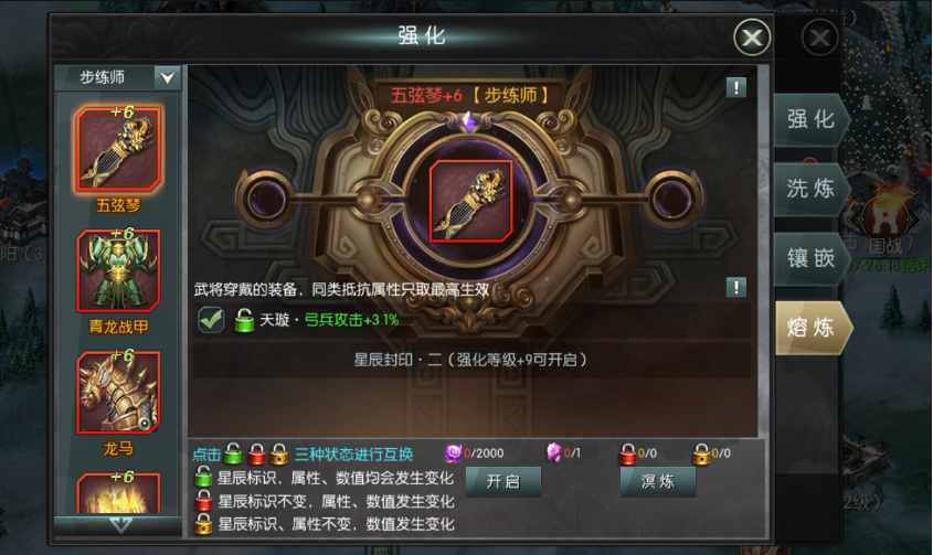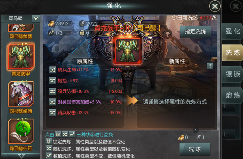 2.?洗練屬性中有三個屬性必須為兵種的加成,這三個就是對應你的武將所帶的兵種,分別有(騎兵,弓兵,步兵)一定要洗練到你相對應的兵種,若你的武將帶的是騎兵,就一定要把4件裝備洗練到騎兵的加成,給武將最大值的(生命,防御,攻擊加成)。