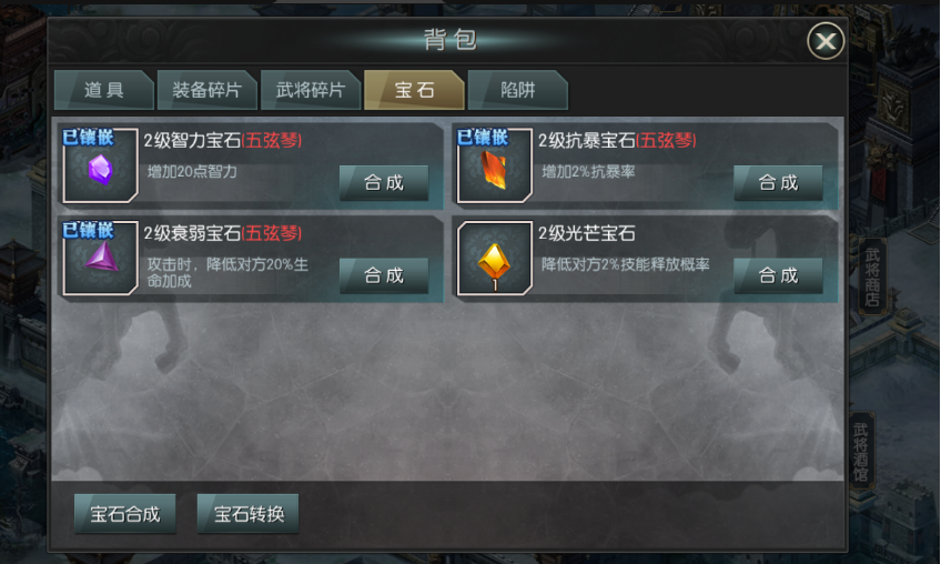??寶石:優(yōu)先(技能釋放屬性寶石,攻擊寶石,元素寶石,暴擊寶石)輸出武將的技能一定要每個回合都能釋放。