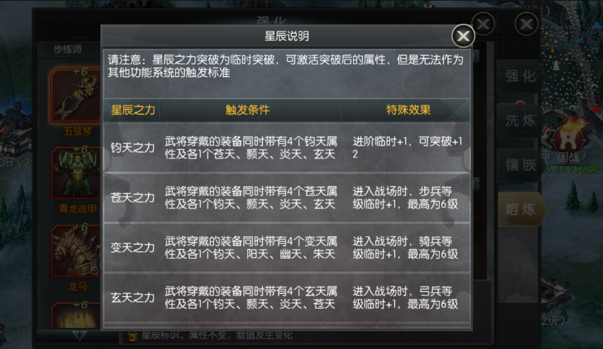 當武將裝備上觸發(fā)條件的擁有星辰之力的裝備套裝時,就可以獲得特殊效果,不同的觸發(fā)條件擁有不同的特殊效果。