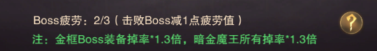 挑戰(zhàn)BOSS需要消耗BOSS疲勞,每天有3次的免費(fèi)挑戰(zhàn)機(jī)會。隨著轉(zhuǎn)生等級的提高,可以挑戰(zhàn)的層數(shù)就越高,其中每層的黃金領(lǐng)主與暗金魔王裝備掉率是1.3倍,建議把次數(shù)都用于挑戰(zhàn)這兩個(gè)BOSS。