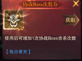 BOSS疲勞:可以通過消耗協(xié)戰(zhàn)BOSS次數(shù)券來恢復(fù)疲勞。當(dāng)前只能通過每日累充來獲取。獲取途徑比較有限,但建議每天都拿到。
