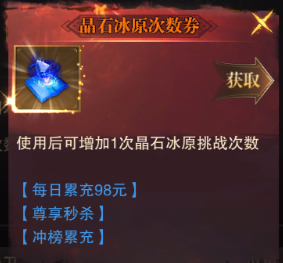 挑戰(zhàn)機(jī)會:成為SVIP后可以通過花費(fèi)20泰坦幣來購買多1次挑戰(zhàn)機(jī)會。也可以使用晶石冰原次數(shù)券來增加挑戰(zhàn)次數(shù)。晶石冰原次數(shù)券獲得的途徑比較多,