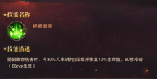 其中 ?絕境潛能-受到致命傷害時,有30%幾率5秒內(nèi)無敵并回復10%的生命值。60秒冷卻時間(僅pvp生效)