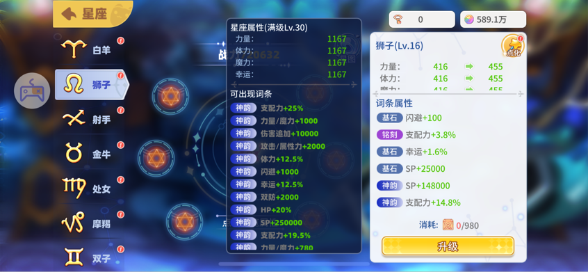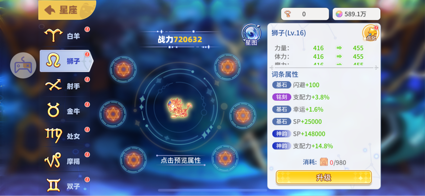挑戰(zhàn)難度越高,獲得的星方和星象秘語也就越多,星方用來升級星座等級,星象秘語用來點(diǎn)化星座屬性。