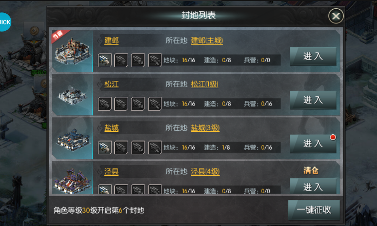農(nóng)場,木廠,銅礦建筑等級越高產(chǎn)量與儲存上線越高,兵營需要升級才能招募到更高級的兵力,封地是在世界上面的城池上面封的,城池等級越高對封地建筑的提升越高。封地每五級開啟一個新的封地。