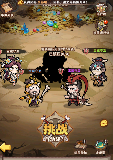 2,尋龍?zhí)綄?,探寶可獲取神器碎片和神器鍛造石還有天宮石,該模式建議上陣比較強力的角色去闖關(guān),闖關(guān)越多獲取的材料越多,(有能力的可以把神器通行證購買)卡關(guān)的時候可以使用封印卷軸闖到下一關(guān)