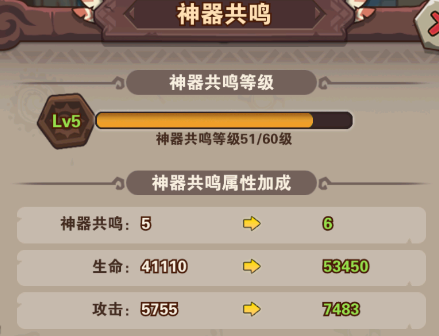 神器可通過強(qiáng)化提升等級(jí),這邊建議是要平均升每一個(gè)神器的等級(jí),有共鳴等級(jí)屬性加成的,而且也能增加每一個(gè)神器的屬性傷害。
