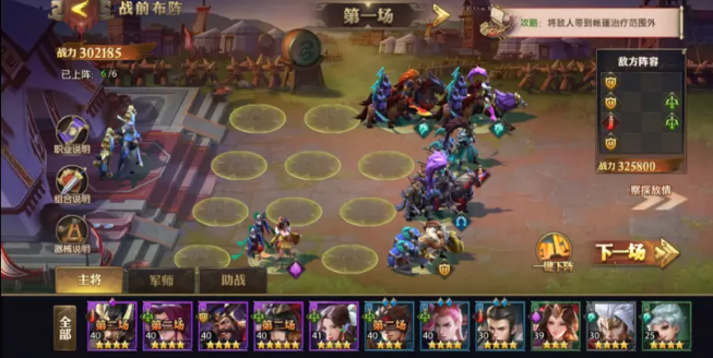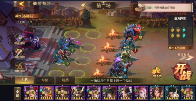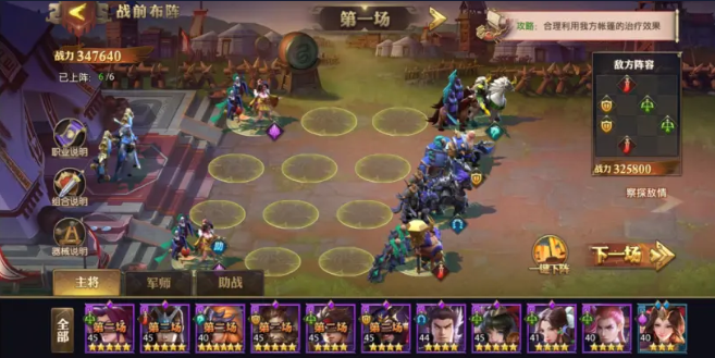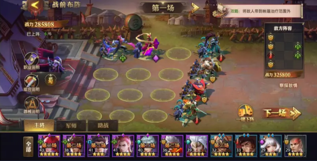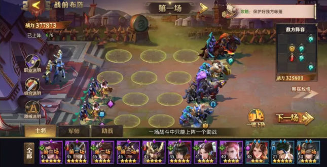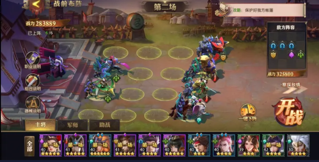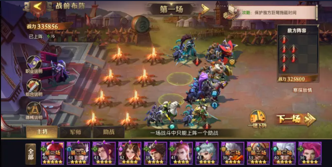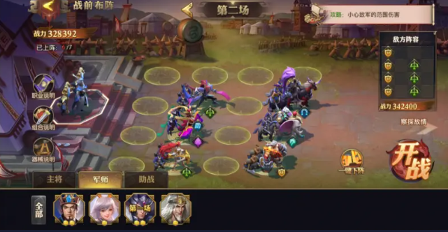 第三關(guān)敵方陣容比較單一己方也不要選什么花里胡哨的,分配戰(zhàn)力、上陣傳統(tǒng)陣容即可,要注意的是面對敵方多輕騎陣容時,要保護(hù)好己方輸出主將,保證雙C安全,陣容才能夠穩(wěn)定。